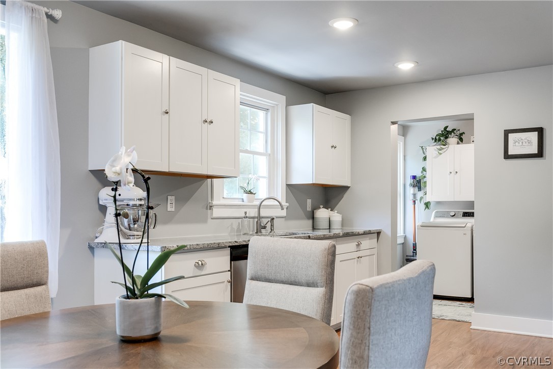 Welcome to this adorable and thoughtfully renovated cape-style home located in Woodside Court. This three-bedroom, two-bathroom gem perfectly blends city convenience with modern appeal. As you enter, you are greeted by a spacious living area that seamlessly flows into an additional sitting space each containing large windows for bright, natural lighting throughout. The heart of the home lies in the kitchen, boasting beautiful granite counters, sleek white cabinets, and top-of-the-line stainless steel appliances. Beyond the kitchen, the laundry room is complete with updated washer and dryer units and newly installed cabinets and shelving for ample storage. The main level also features two bedrooms, each with its own closet, and a full bathroom for added convenience. Upstairs, the primary bedroom suite awaits, offering an adjoining room currently used as an office, but easily adaptable to suit your needs. Another full bathroom on this level ensures comfort and functionality. Prepare to be wowed by the backyard! The large back patio, fenced yard, and newly installed fire pit area create the perfect setting for outdoor entertaining or relaxing. A spacious detached garage provides additional storage as well. The prime city location is walkable, just a mile from Forest Hill Park and some of the city's best local spots like Crossroads Coffee & Ice Cream, WPA Bakery, and Laura Lee's. It is also only minutes away from top-rated trails and the South of the James Famer's Market. The ideal location and the meticulous upkeep truly make this home move-in ready, so you won't want to miss the opportunity to make it your own!